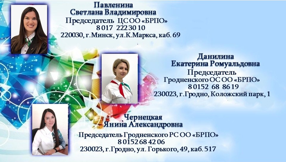 Первый секретарь Центрального комитета Александр Сергеевич Лукьянов 220030, г. Минск, ул. К. Маркса, 40 Центральный комитет ОО "БРСМ" |